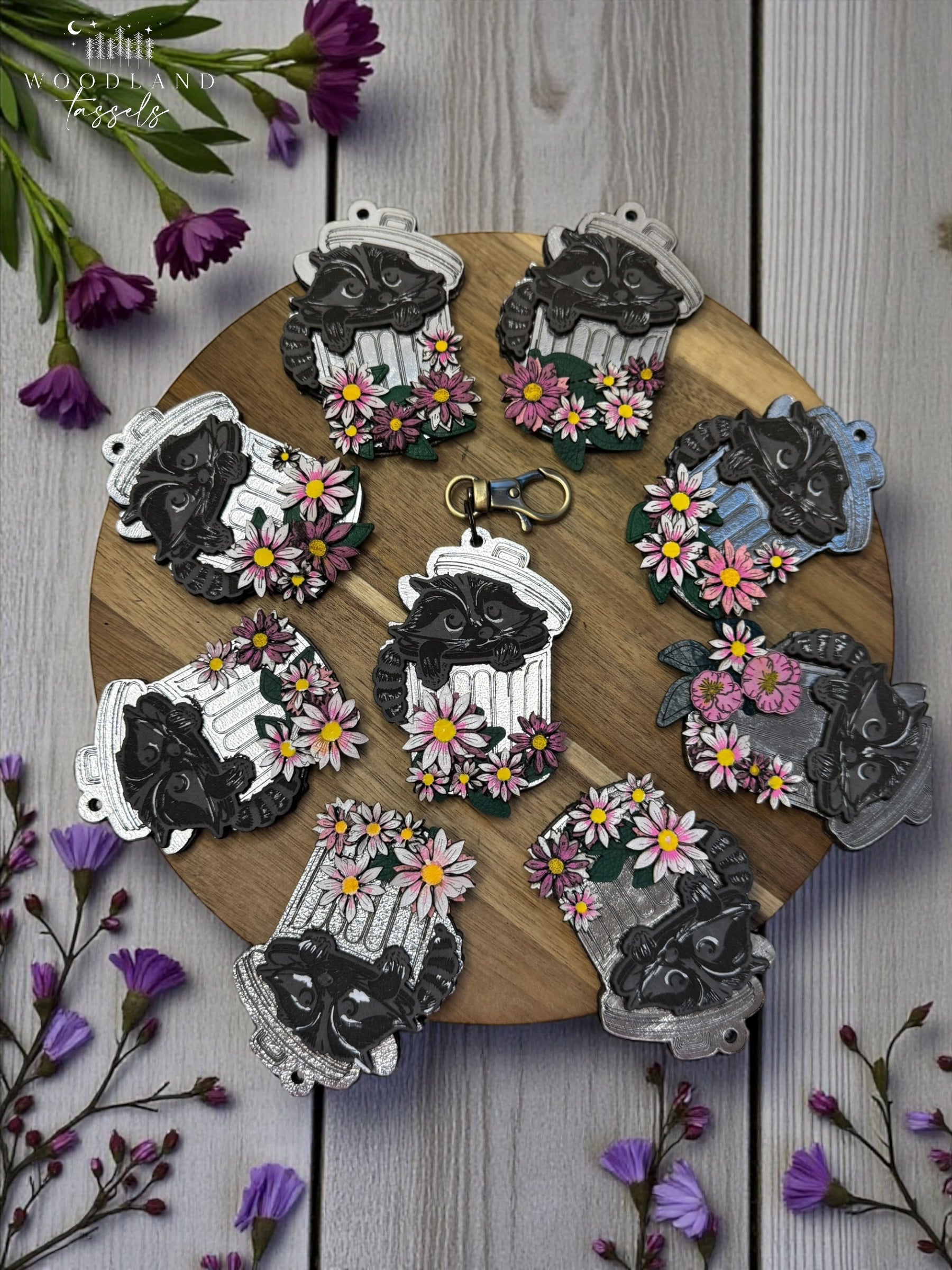 Each leather purse charm features a sweet raccoon little, peeking out of a dainty leather garbage can and surrounded by soft, hand-painted leather flowers in delicate, fainted tones. Every detail is carefully crafted by hand, making each charm truly one of a kind—no two raccoons are ever exactly alike.