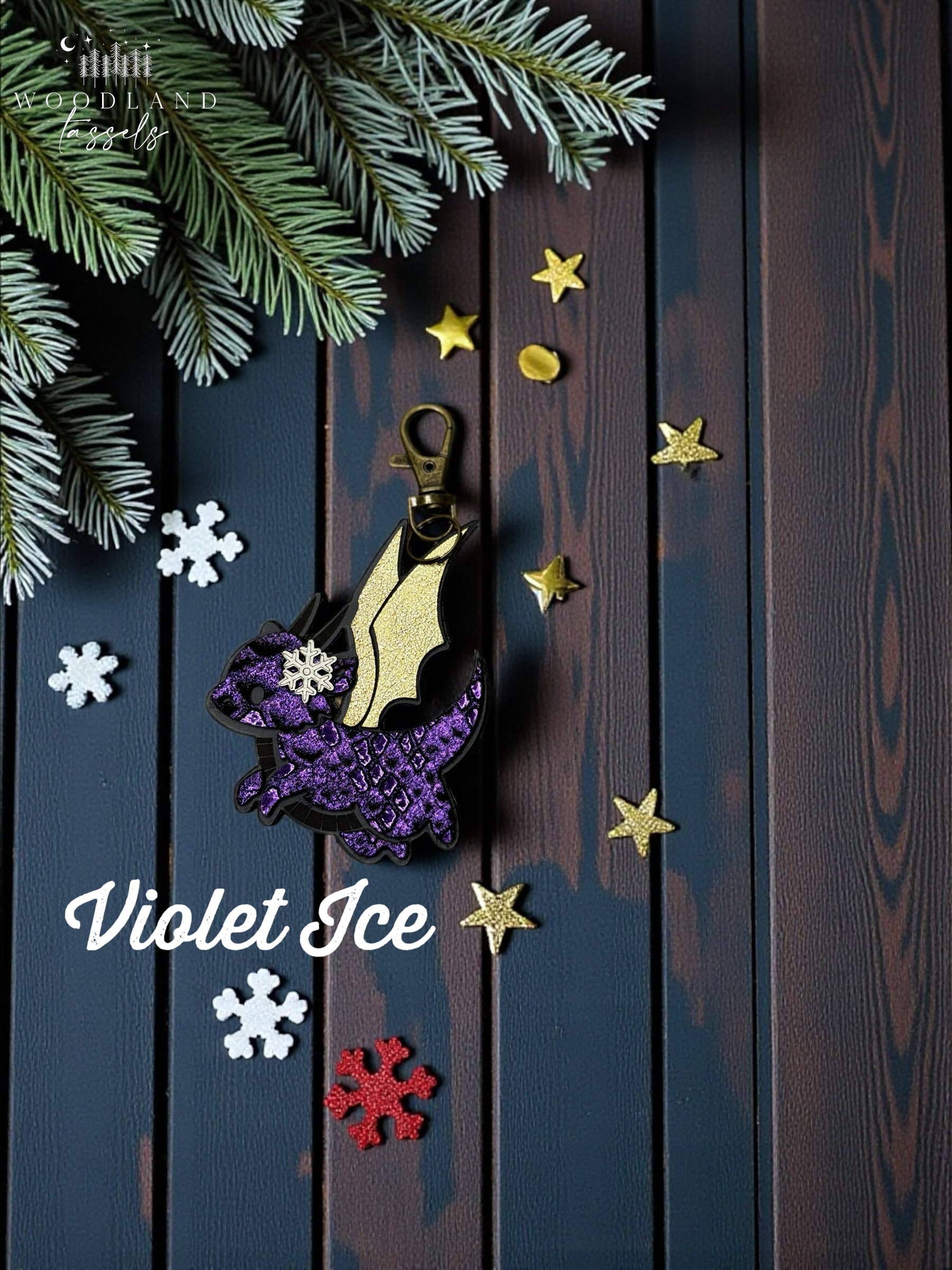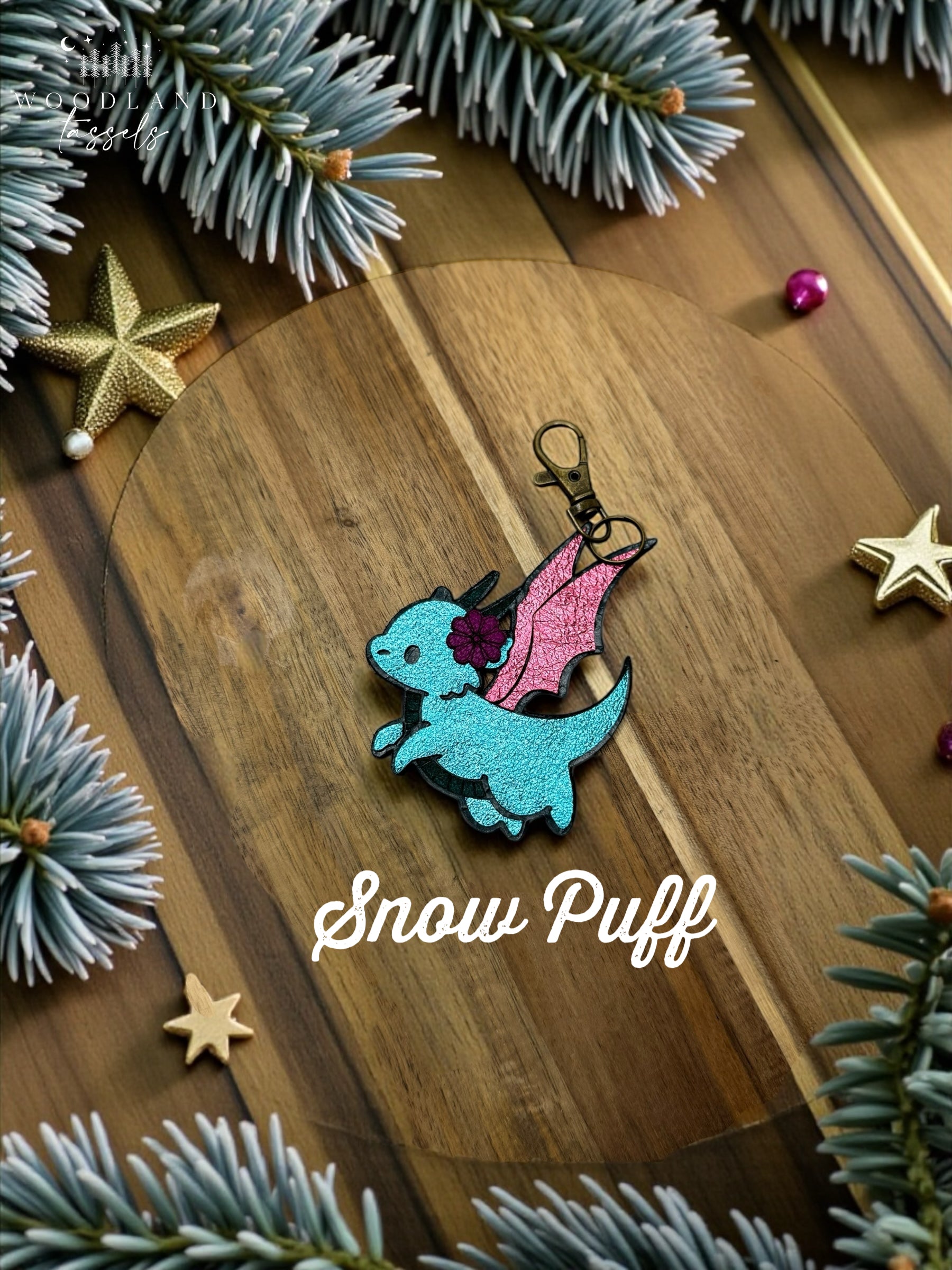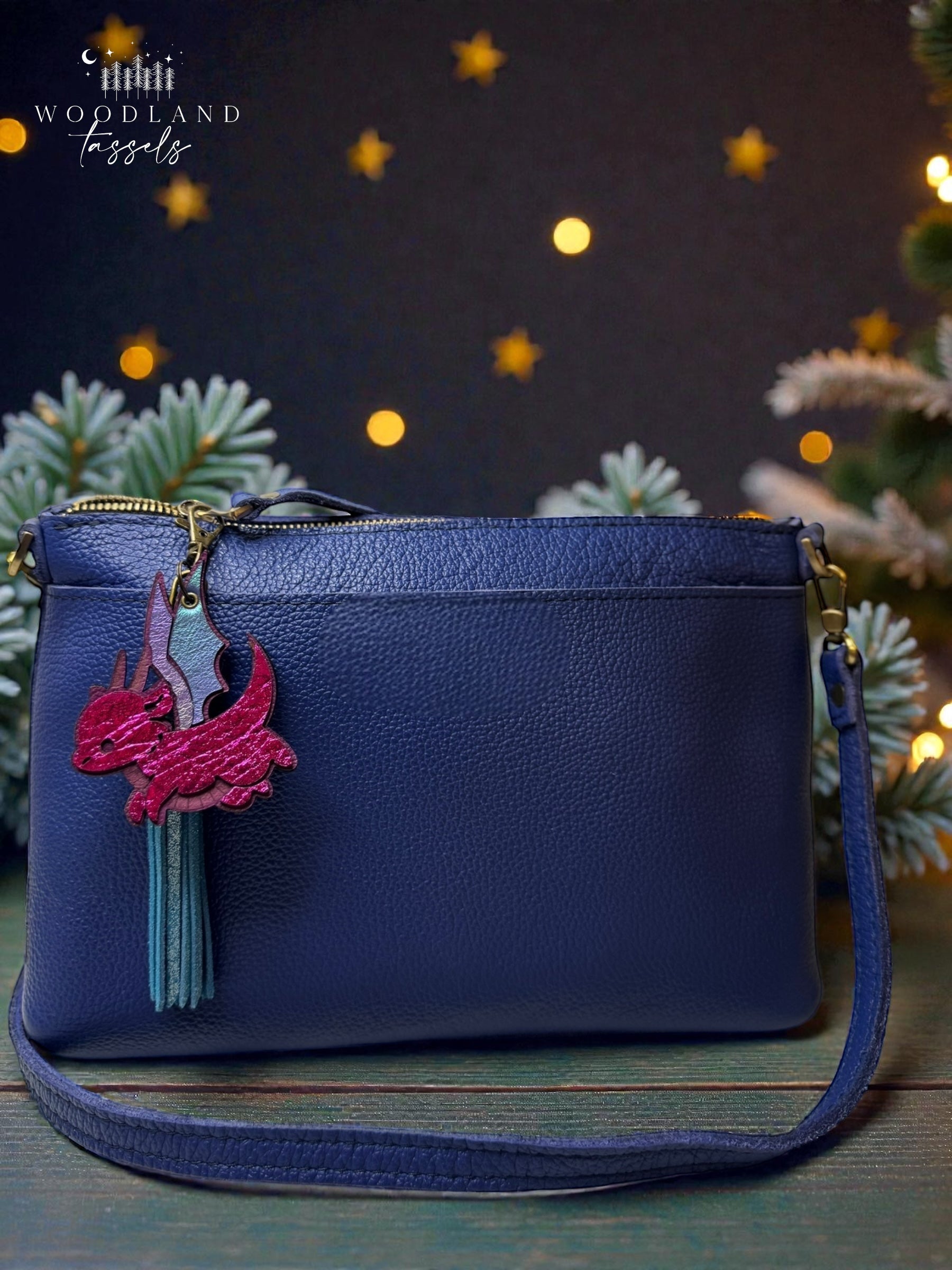 Meet the Smol Dragon Winter Charm, a tiny burst of character ready to perch on your favorite handbag. Each dragon is designed, cut, painted, and finished by hand in our Woodland Tassels leather studio using premium American-sourced leather. This limited winter release features vibrant seasonal colors including purples, pinks, blues, browns, and crisp winter whites.