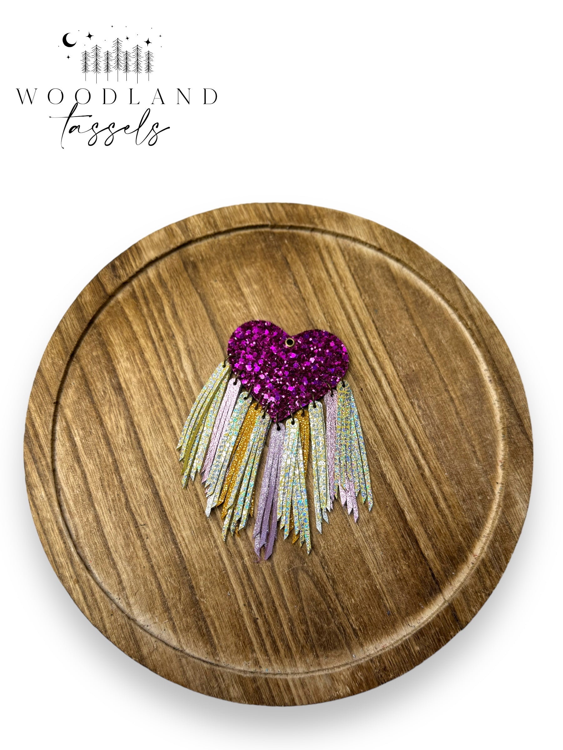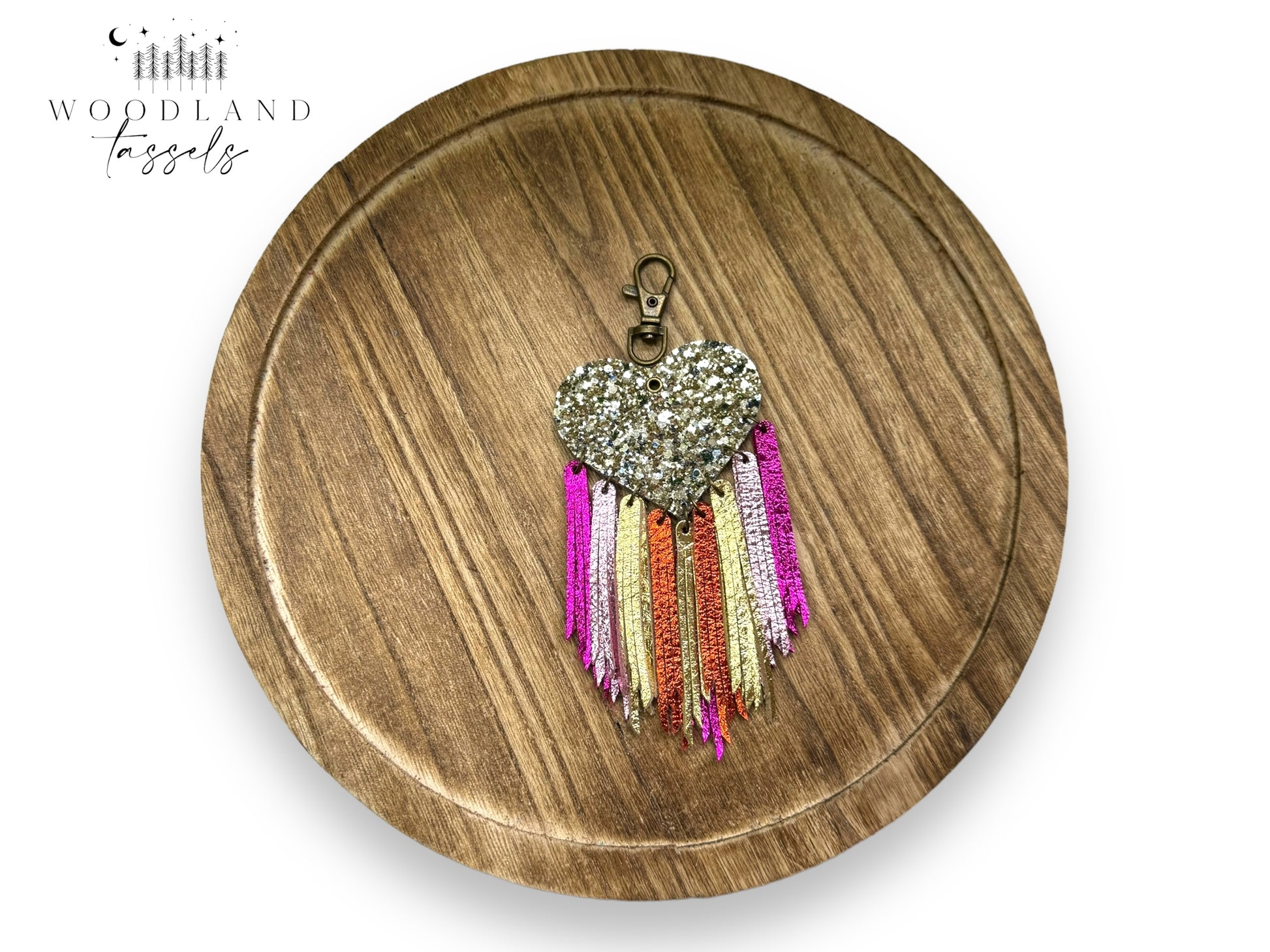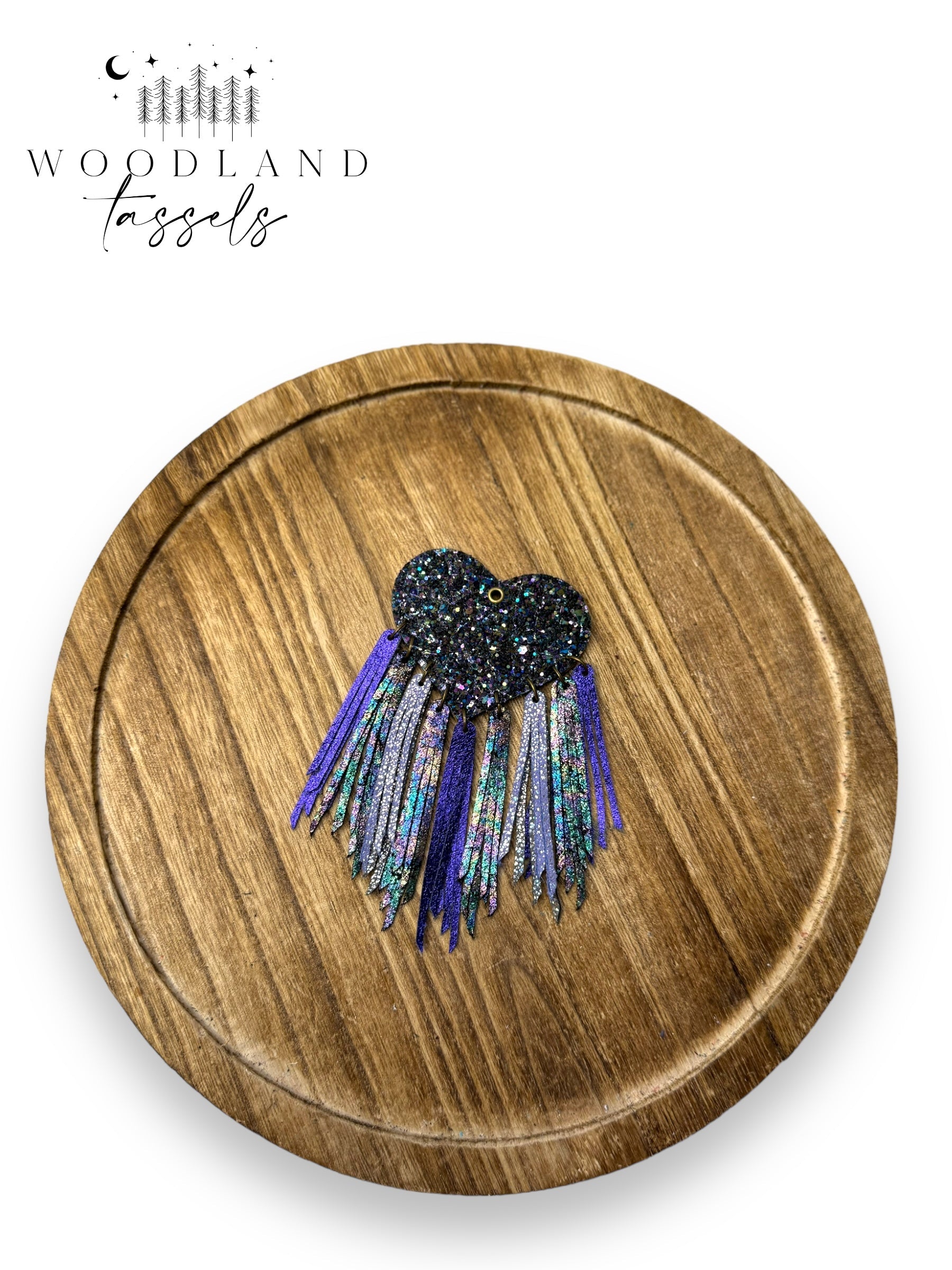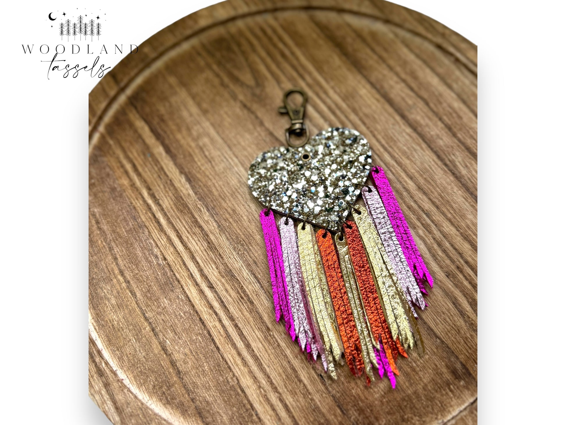 Revamp your handbag collection with the SweetHeart Genuine Leather Purse Charm. This charm is meticulously handcrafted with superior-quality leather, and showcases a distinctive cosmic design that adds a hint of shimmer to any bag. Let your individuality shine with this exceptional piece. Made exclusively by Woodland Tassels, each item is crafted from genuine leather and natural cork, and is handmade in Washington State for a truly unique touch.